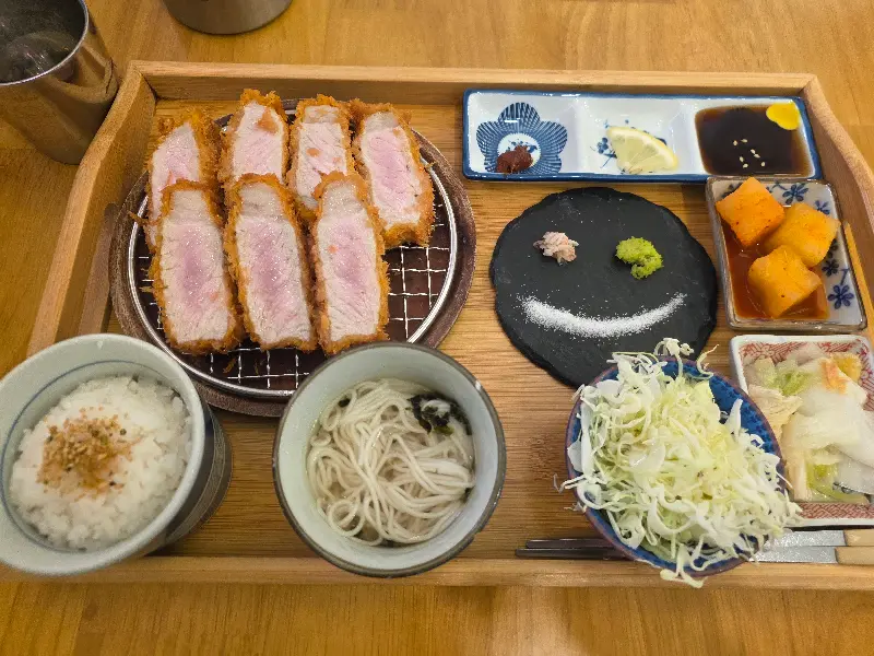 안심카츠는 겉은 바삭하고 속은 촉촉한 완벽한 조화를 자랑했다. 튀김옷은 얇고 바삭했으며, 돼지고기는 입안에서 살살 녹는 듯 부드러웠다. 함께 제공된 밥, 국수, 샐러드, 깍두기, 단호박 조림, 각종 소스들도 하나하나 정성이 느껴졌다. 특히 흑색 돌판 위에 소금, 와사비, 다진 생강을 가지런히 담아 놓은 모습이 인상적이었다. 다양한 곁들임 덕분에 돈카츠를 질릴 틈 없이 즐길 수 있었다.