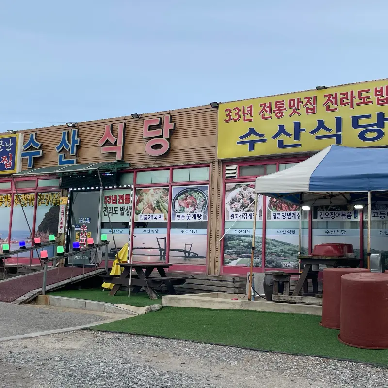 사실 안면도에는 게국지를 내는 식당이 워낙 많다. 하지만 어릴 적 방문했던 기억을 더듬어, 꽃지해수욕장 주차장 근처에 자리 잡은 꽃지수산식당으로 향했다. 33년 전통의 맛집이라는 간판이 왠지 모를 믿음을 주었다. 겉모습은 소박했지만, 오히려 그런 점이 오랜 세월 동안 변치 않은 맛을 지켜왔을 것 같다는 기대를 불러일으켰다. 멀리서도 눈에 띄는 노란색 간판과 큼지막하게 쓰인 ‘수산식당’이라는 글자가 정겨웠다.