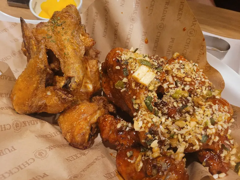 가게 문을 열자, 깔끔하고 넓은 매장이 눈에 들어왔다. 은은한 조명 아래 편안하게 배치된 테이블들이 인상적이었다. 벽면에 걸린 감각적인 그림들은 이곳이 단순한 치킨집이 아닌, 세련된 공간임을 느끼게 했다. 벽돌 질감의 벽에 새겨진 푸라닭 로고는 왠지 모르게 믿음직스러웠다.