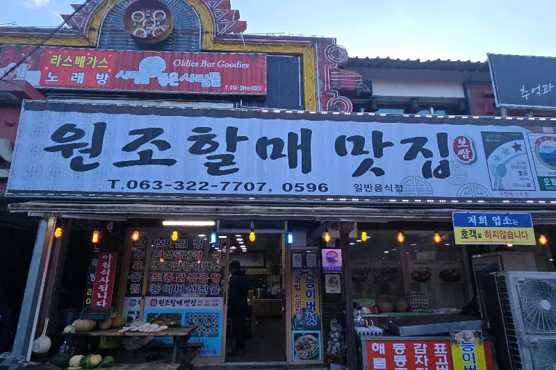 식당 앞에 도착하니, 낡은 간판이 세월의 흔적을 고스란히 보여주고 있었다. 에서 보듯, 주변 상가들과 함께 정겹게 자리 잡은 모습이었다. 커다란 글씨로 쓰인 “원조할매맛집”이라는 상호가 왠지 모르게 믿음직스러웠다. 을 보면, 가게 앞에는 메뉴판과 함께 싱싱한 채소들이 놓여 있어 더욱 기대감을 높였다. 문을 열고 들어서자, 따뜻한 온기가 느껴졌다.