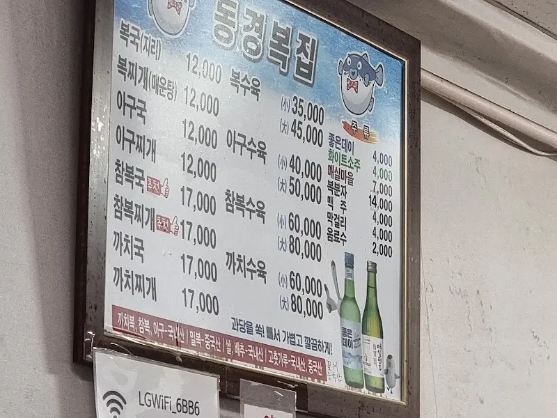 문을 열자 생각보다 넓지 않은 공간이 나타났다. 안쪽으로 길게 뻗은 구조였는데, 테이블 간 간격은 적당해서 혼자 온 나도 편안하게 자리를 잡을 수 있었다. 벽에 붙은 메뉴판을 보니 복국, 복매운탕, 아구 요리 등 다양한 메뉴가 눈에 띄었다. 가격은 복집 거리의 다른 곳들에 비해 저렴한 편이라고 한다. 아침 일찍부터 복국을 찾는 손님들이 꽤 있었다.
