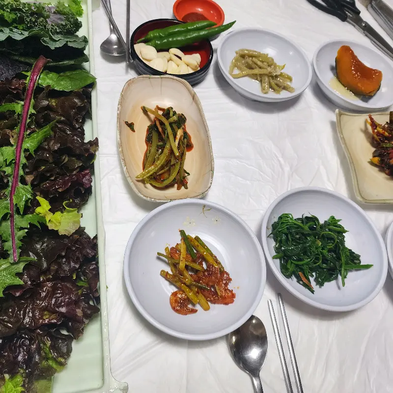 메뉴판을 살펴보니, 삼겹살, 찌개, 우렁쌈장 등 다양한 메뉴가 있었다. 혼자 왔지만, 삼겹살의 유혹을 뿌리칠 수 없었다. 삼겹살 1인분과 된장찌개를 주문했다. 잠시 후, 밑반찬들이 테이블 가득 차려졌다. 과 에서 보았던 것처럼, 반찬의 가짓수가 정말 많았다. 쌈 채소도 푸짐하게 담겨 나왔다. 싱싱한 쌈 채소를 보니, 절로 군침이 돌았다. 특히, 우렁쌈장이 눈에 띄었다. 뚝배기에 담겨 나온 우렁쌈장은 보기만 해도 구수해 보였다.