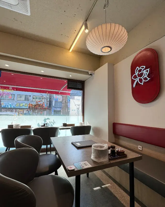 가게 문을 열고 들어서자, 생각보다 훨씬 넓고 깔끔한 공간이 눈에 들어왔다. 은은한 조명 아래 놓인 테이블들은 간격이 넓어 편안하게 식사를 즐길 수 있는 분위기였다. 흔히 생각하는 허름한 중국집이 아니라, 오히려 세련된 인테리어가 돋보여서 마치 분위기 좋은 레스토랑에 온 듯한 느낌마저 들었다. 벽 한쪽에는 다양한 술병들이 진열되어 있어 독특한 분위기를 더했다. 에서 보이는 것처럼, 깔끔한 테이블과 은은한 조명, 그리고 정갈하게 놓인 식기들이 인상적이었다. 혼자 왔지만 전혀 어색하지 않은, 오히려 혼밥을 즐기기에 더없이 좋은 공간이라는 생각이 들었다.