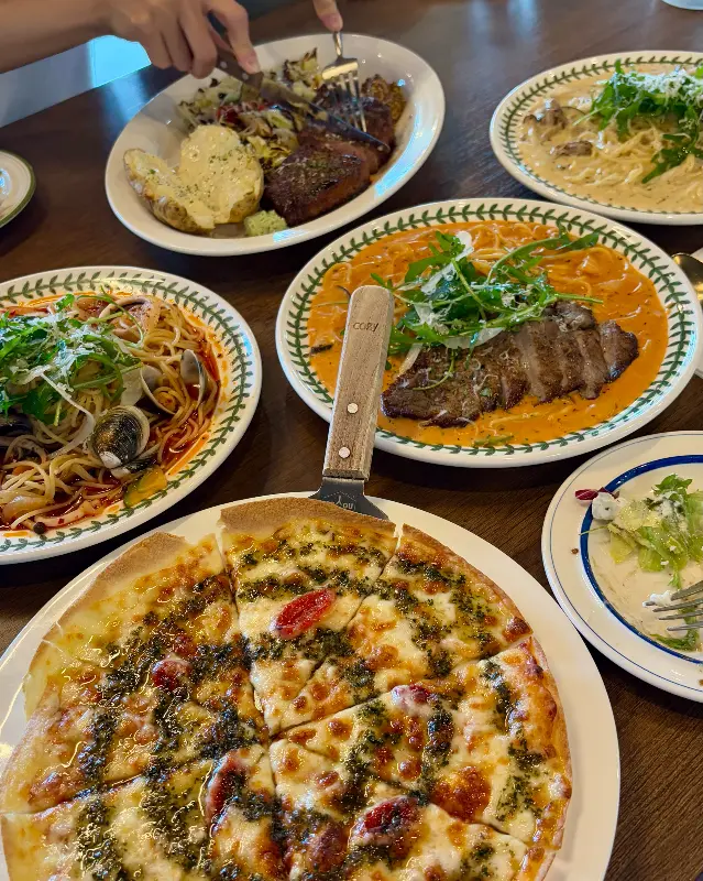 평일 점심시간이었음에도 불구하고 이미 많은 사람들로 북적였다. 다행히 미리 예약을 해둔 덕분에 기다리지 않고 바로 자리를 안내받을 수 있었다. 테이블 간 간격이 넓어서 편안하게 식사를 즐길 수 있다는 점이 마음에 들었다. 메뉴판을 받아 들고 한참을 고민했다. 파스타, 스테이크, 샐러드 등 다양한 메뉴들이 눈길을 끌었고, 하나같이 맛있어 보여서 결정하기가 쉽지 않았다. 결국, 직원분께 추천을 받아 몇 가지 메뉴를 주문했다.