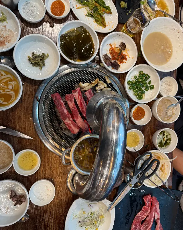 숯불 위에 구워지고 있는 갈비살과 푸짐한 밑반찬