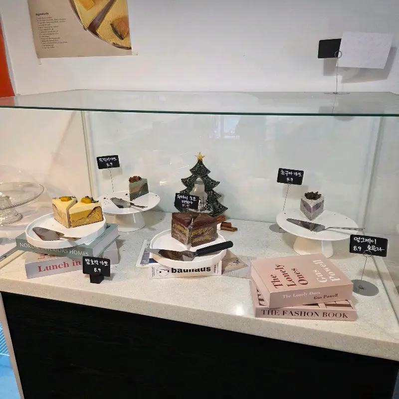 문을 열자 따뜻한 조명과 은은한 커피 향이 나를 맞이했다. 카페 내부는 생각보다 넓었고, 테이블 간 간격도 넉넉해서 편안하게 대화를 나눌 수 있는 분위기였다. 한쪽 벽면에는 크리스마스트리가 장식되어 있었는데, 반짝이는 조명 덕분에 더욱 아늑하고 따뜻하게 느껴졌다. 트리 옆으로는 쇼케이스가 놓여 있었는데, 그 안에는 형형색색의 갸또 케이크들이 나란히 진열되어 있었다. 보기만 해도 황홀해지는 비주얼에, 나는 마치 보석이라도 구경하는 듯 한참 동안 눈을 떼지 못했다.