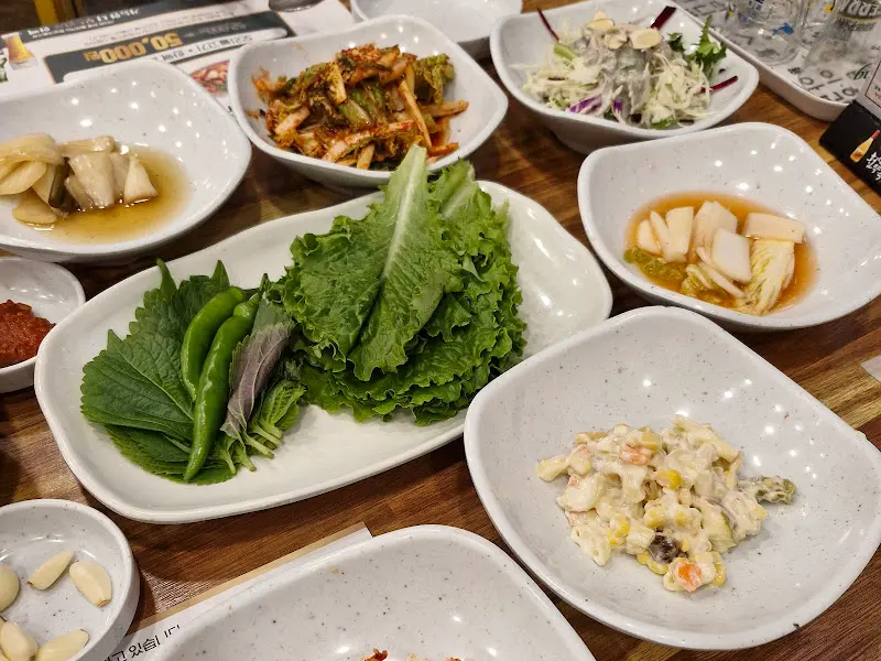 자리에 앉자마자 시원한 바람이 살랑살랑 불어왔다. 팔공산의 청정한 공기가 코끝을 간지럽히는 듯했다. 테이블 위에는 곧 정갈한 밑반찬들이 차려졌다. 싱싱한 쌈 채소, 샐러드, 묵은지, 깻잎 장아찌 등 하나하나 정성이 느껴지는 맛깔스러운 반찬들이었다. 특히, 마늘 향이 은은하게 퍼지는 샐러드는 입맛을 돋우기에 충분했다.