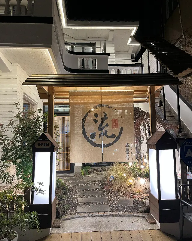 오랜만에 따스한 햇살이 기분 좋게 쏟아지던 날, 싱그러운 기운을 만끽하고자 집을 나섰다. 목적지는 늘 활기가 넘치는 온천천 카페거리. 천변을 따라 여유롭게 산책을 즐기다 보니 어느새 점심시간이 훌쩍 넘어 있었다. 뭘 먹을까 고민하며 거리를 걷던 중, 독특한 외관의 한 식당이 눈에 들어왔다. 일본 감성이 물씬 풍기는, 마치 작은 교토의 골목길에 있을 법한 아담한 식당이었다. “흐를류”라는 정감 있는 이름이 발길을 붙잡았다. 왠지 모르게 맛있는 음식이 있을 것 같은 예감이 들었다.