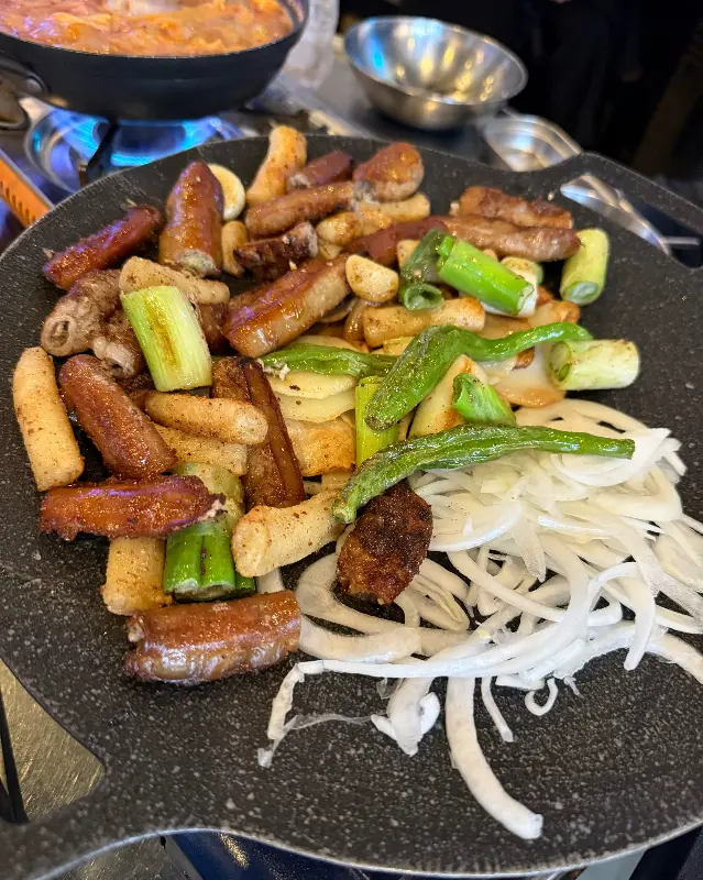 주문을 마치자, 밑반찬들이 하나둘씩 테이블 위를 채우기 시작했다. 곱창과 환상적인 궁합을 자랑하는 김치, 양파 장아찌, 깻잎 장아찌 등 푸짐한 구성에 감탄했다. 특히 눈길을 사로잡은 것은 곱창전골 서비스! 네이버 예약을 통해 방문하면 곱창전골 1인분을 서비스로 제공한다고 한다. 얼큰하면서도 깊은 맛이 일품인 곱창전골은, 곱창이 구워지기를 기다리는 동안 입맛을 돋우기에 충분했다.