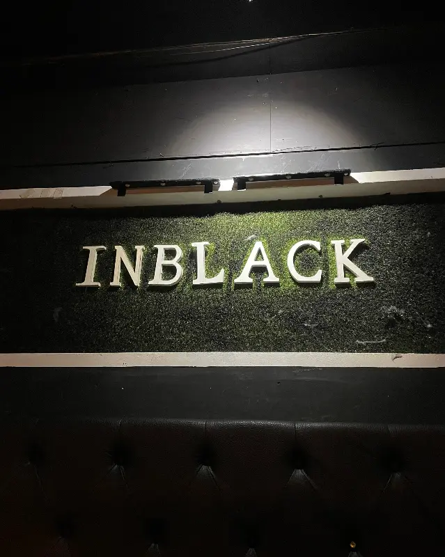 문을 열자마자 감각적인 인테리어가 눈에 들어왔다. 은은한 조명 아래, 세련된 분위기가 물씬 풍기는 것이 여느 술집과는 차별화된 느낌이었다. 벽 한쪽에 크게 박힌 “INBLACK” 로고가 인상적이었고, 검정색 가죽 소파는 왠지 모르게 편안함을 선사했다.