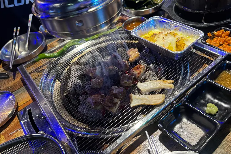 드디어 기다리고 기다리던 고기가 등장했다. 붉은 빛깔의 신선한 고기, 그 위에 뿌려진 허브 가루가 식욕을 더욱 자극했다. 뜨겁게 달궈진 숯불 위에 고기를 올리자, 치-익 소리와 함께 맛있는 냄새가 코를 찔렀다. 연기가 피어오르며 시야를 가렸지만, 그 속에서 익어가는 고기의 모습은 그 어떤 풍경보다 아름다웠다.