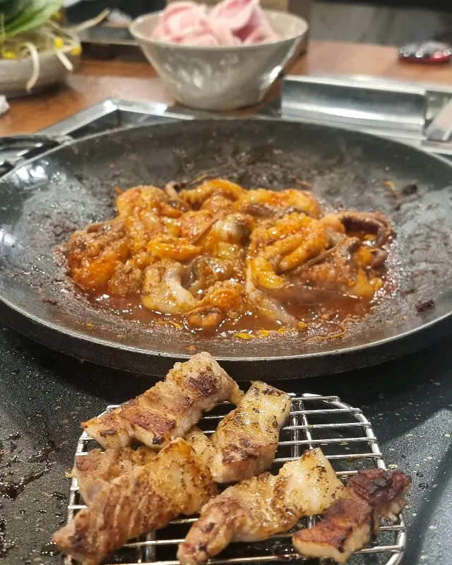 불판이 달궈지기 시작하자, 직원분께서 능숙한 솜씨로 쭈꾸미와 삼겹살을 올려주셨다. 초벌된 삼겹살은 기다림 없이 바로 먹을 수 있다는 점이 좋았다. 지글거리는 소리와 함께 매콤한 쭈꾸미 향이 코를 자극하며 식욕을 더욱 끌어올렸다.