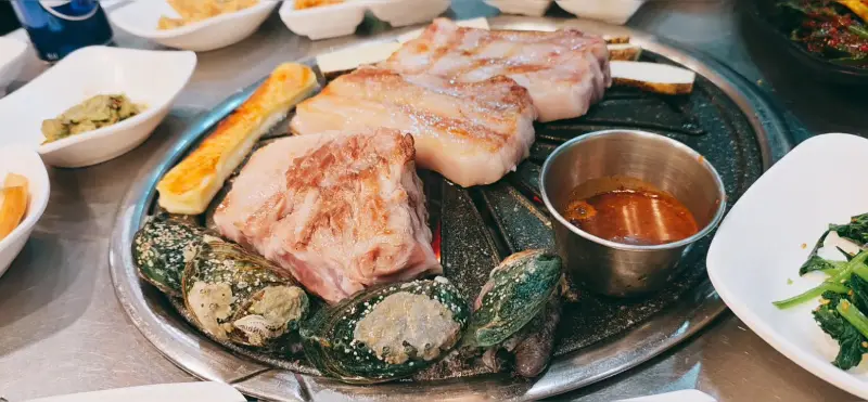오겹살과 목살, 그리고 뿔소라와 전복까지 한 번에 즐길 수 있는 “활화산 세트”를 주문했다.