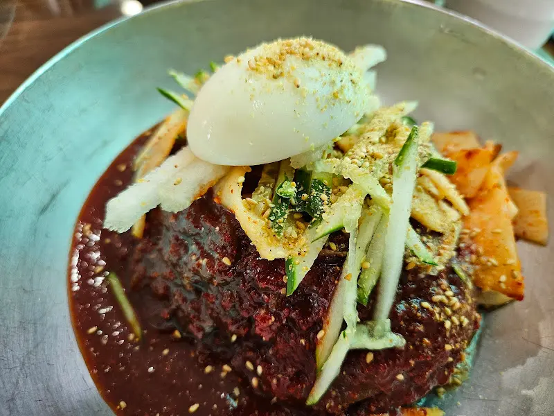 드디어 기다리던 냉면이 나왔다. 먼저 물냉면! 뽀얀 육수 위에 가지런히 놓인 냉면 사리와 오이, 무, 그리고 삶은 계란 반쪽이 먹음직스러워 보였다. 살얼음이 동동 떠 있는 육수를 한 모금 들이키니, 시원함이 온몸에 퍼져나갔다. 면은 칡냉면이라 그런지 일반 냉면보다 조금 더 쫄깃하고 탄력이 있었다. 육수는 깔끔하면서도 깊은 맛이 느껴졌다.