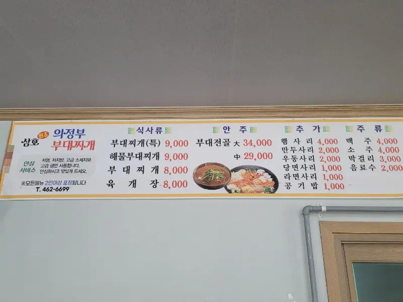 가게에 들어서자, 깔끔하고 청결한 분위기가 가장 먼저 눈에 들어왔다. 테이블 간 간격도 넉넉해서 편안하게 식사를 즐길 수 있을 것 같았다. 벽에 붙은 메뉴판을 보니 부대찌개, 해물 부대찌개, 섞어찌개, 육개장 등 다양한 메뉴가 있었다. 하지만 나의 선택은 이미 정해져 있었다. 바로 이 집의 대표 메뉴인 부대찌개였다.