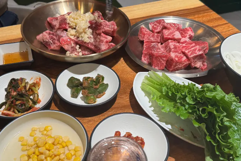 다양한 밑반찬과 큐브 눈꽃살, 마늘 갈비살이 담긴 쟁반