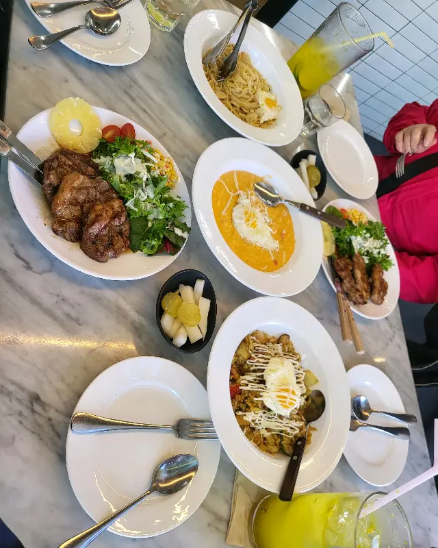 드디어 기다리던 메뉴들이 하나둘씩 테이블 위에 놓이기 시작했다. 가장 먼저 눈에 들어온 것은 역시 목살 스테이크 샐러드였다. 커다란 접시 위에 큼지막한 목살 스테이크 세 덩이가 가지런히 놓여 있었고, 싱싱한 샐러드와 파인애플 슬라이스가 곁들여져 있었다. 스테이크 위에는 먹음직스러운 계란 프라이가 올라가 있었다.