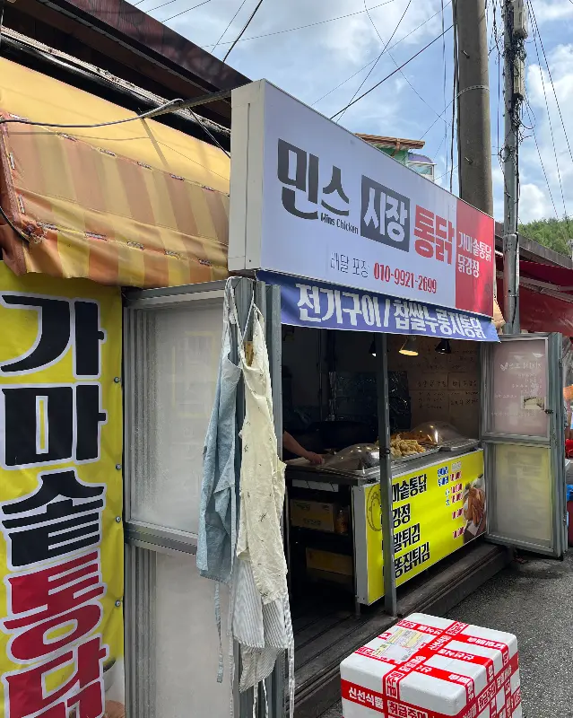 황지시장에 들어서자, 정겨운 시장 풍경이 눈에 들어왔다. 활기 넘치는 상인들의 목소리, 싱싱한 채소와 과일 냄새, 그리고 맛있는 음식 냄새가 코를 자극했다. 그중에서도 나의 발길을 잡아끈 것은 단연 ‘민스 시장 통닭 닭강정’이었다. 멀리서도 눈에 띄는 간판, “민스 시장 통닭”이라는 글자가 큼지막하게 쓰여 있었다. 노란색 배경에 검은색 글씨로 큼지막하게 써진 메뉴판은 시선을 사로잡았다. 닭강정과 닭똥집 튀김 사진이 먹음직스럽게 보였다.