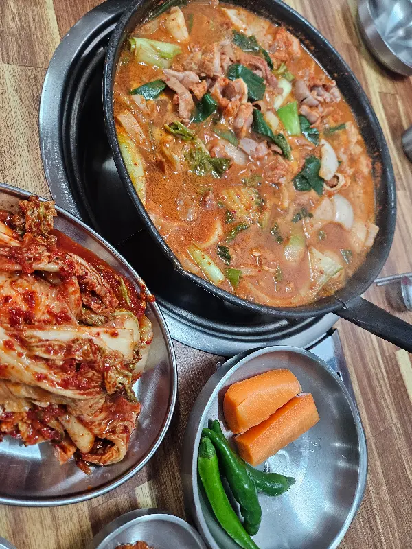 드디어 기다리고 기다리던 곱창전골이 테이블 위에 놓였다. 얕은 냄비 안에는 곱창, 양배추, 쑥갓, 그리고 붉은 양념이 가득 담겨 있었다. 김치와 곁들여 나오는 모습이 정겹다. 국물이 끓기 시작하자, 매콤한 향이 더욱 강렬하게 코를 자극했다. 에서 보았던 것처럼 냄비 가장자리에 보글보글 끓는 모습은 식욕을 돋우기에 충분했다.