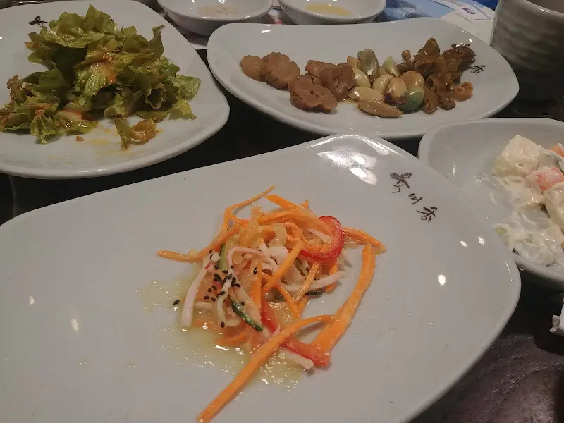 주문 후, 정갈하게 차려진 밑반찬들이 하나둘씩 테이블을 채워나갔다. 샐러드, 잡채, 김치 등 다채로운 구성이 눈을 즐겁게 했다. 특히 신선한 야채 샐러드는 입맛을 돋우기에 충분했다. 쌉쌀하면서도 상큼한 드레싱이 어우러져 식욕을 자극했다. 곁들여 나온 반찬들은 하나하나 정성이 느껴지는 맛이었다.