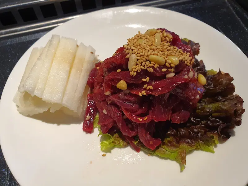 가장 먼저 육회가 나왔다. 붉은 빛깔이 선명한 육회 위에는 참깨와 잣이 넉넉하게 뿌려져 있었다. 신선한 육회 한 점을 입에 넣으니, 입안 가득 고소한 풍미가 퍼져 나갔다. 쫄깃하면서도 부드러운 식감이 일품이었다. 함께 나온 배와 곁들여 먹으니, 달콤함까지 더해져 더욱 맛있었다.