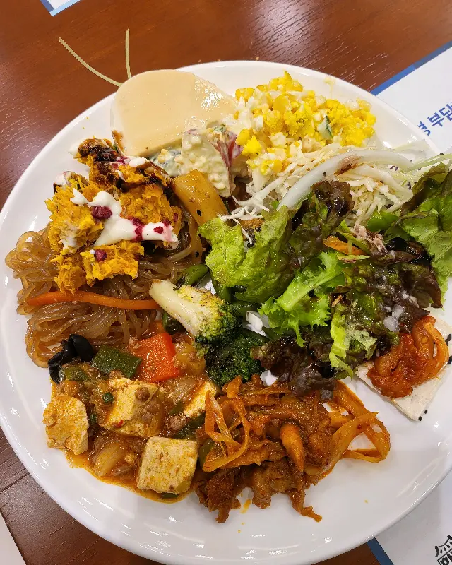 뷔페 테이블에는 정말 다양한 음식들이 보기 좋게 진열되어 있었다. 한식 뷔페라고 해서 흔한 메뉴들만 있을 거라고 생각했는데, 예상을 훨씬 뛰어넘는 구성이었다. 퓨전 한식이라는 설명이 딱 들어맞는 듯했다. 샐러드, 탕수육, 잔치국수, 돈까스, 순대, 토스트, 브로콜리 스프 등등. 정말 없는 게 없었다.