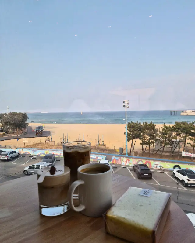 3층에 들어서는 순간, 탄성이 절로 나왔다. 드넓은 통유리창을 통해 쏟아지는 햇살, 눈부시게 빛나는 푸른 바다, 그리고 부드럽게 부서지는 파도 소리까지. 그야말로 완벽한 조화였다. 마치 바다 위에 떠 있는 듯한 기분이 들었다. 창가 자리에 자리를 잡고 메뉴를 살펴보았다. 커피 종류가 정말 다양했다. 핸드드립 커피부터 라떼, 에이드까지. 고민 끝에, 이곳의 시그니처 메뉴라는 피넛버터라떼를 주문했다. 그리고 달콤한 디저트도 빼놓을 수 없지. 앙버터 크루아상을 함께 주문했다.