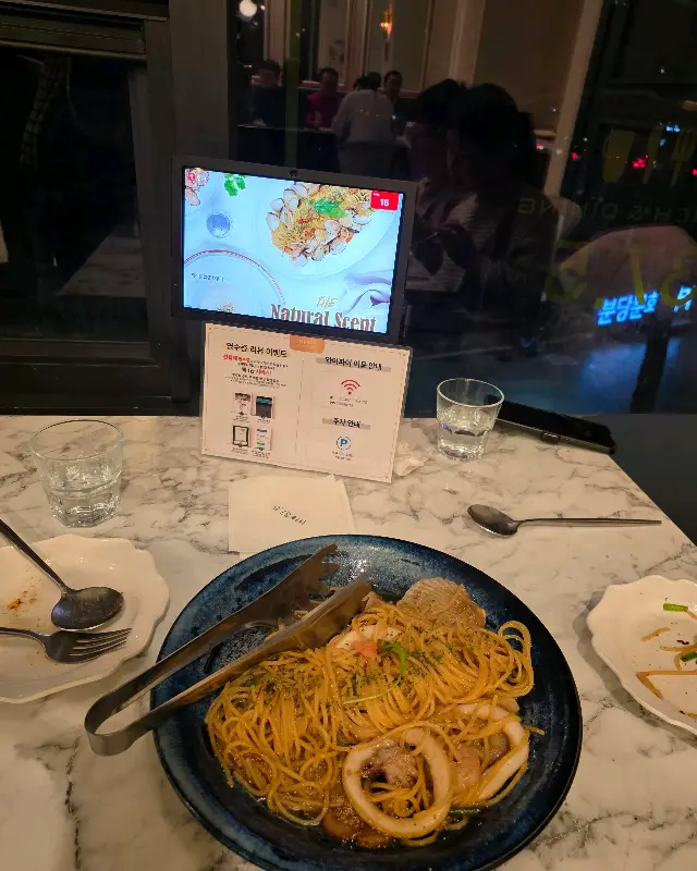 자리를 잡고 앉아 메뉴판을 펼쳐 들었다. 파스타 종류가 정말 다양했다. 크림, 오일, 토마토, 로제… 뭘 먹어야 할지 한참을 고민했다. 그러다 내 눈길을 사로잡은 건 바로 쭈꾸미 페뇨 오일 파스타. 매콤한 오일 파스타에 쭈꾸미라니, 정말 환상적인 조합 아닌가! 평소 오일 파스타를 즐겨 먹는 나로서는 그냥 지나칠 수 없는 메뉴였다. 게다가 후기를 보니 미나리 오일 파스타도 그렇게 맛있다고 칭찬이 자자했다.
