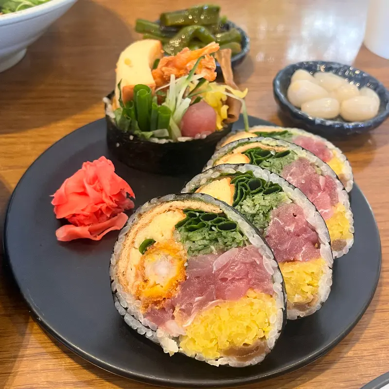 가장 먼저 눈에 들어온 것은 역시 후토마끼였습니다. 큼지막한 김밥 안에는 참치, 새우튀김, 계란, 채소 등 다양한 재료들이 아낌없이 들어 있었습니다. 료미에서는 후토마끼를 한 입에 먹는 것을 추천한다고 합니다. 망설임 없이 입을 크게 벌려 한 입 가득 넣으니, 입안 가득 퍼지는 풍성한 맛과 향이 환상적이었습니다. 특히 신선한 참치의 고소함과 아삭한 채소의 조화가 일품이었습니다.