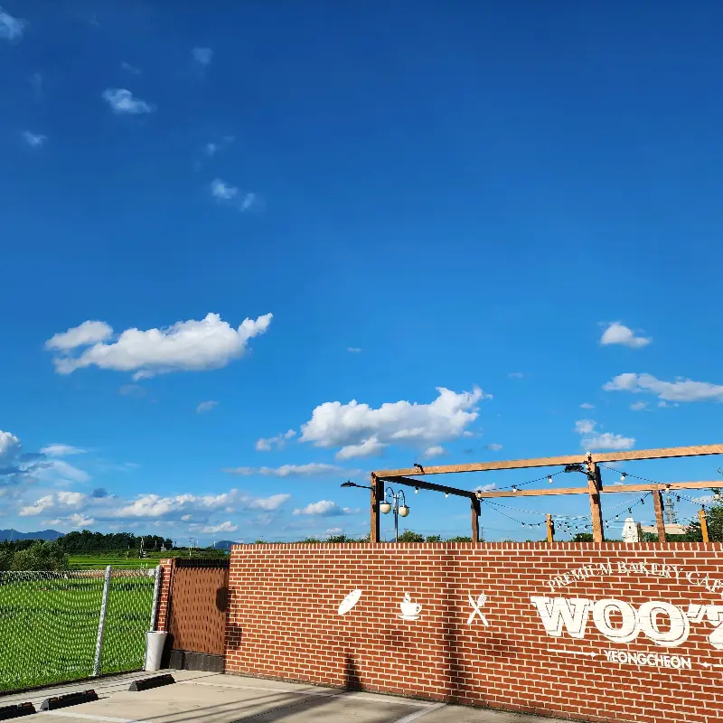 주차장에 차를 대고 카페를 바라보니, 붉은 벽돌 건물이 푸른 하늘과 대비되어 더욱 멋스러웠다. 벽돌에는 흰색 폰트로 “WOO’Z YEONGCHEON”이라는 문구가 새겨져 있었다. 마치 유럽의 어느 작은 마을에 온 듯한 느낌이었다. 건물 뒤편으로는 드넓은 논밭이 펼쳐져 있어, 도심에서 벗어나 자연을 만끽할 수 있다는 점이 매력적이었다.