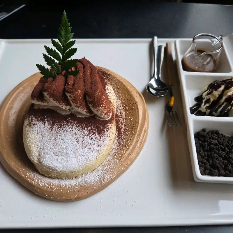 티라미수 수플레 팬케이크의 먹음직스러운 비주얼