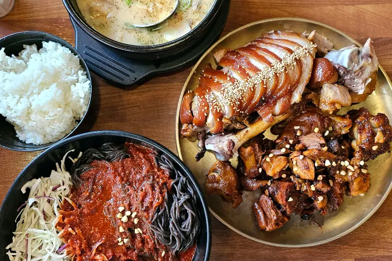 놀라운 점은, 족발을 주문하면 한우사골 술국과 비빔막국수가 서비스로 제공된다는 사실이었다. 커다란 뚝배기에 담겨 나온 술국은 보기만 해도 속이 든든해지는 느낌이었다. 국물을 한 숟가락 떠먹으니, 깊고 진한 사골 육수의 풍미가 입안 가득 퍼졌다. 큼지막하게 썰린 고기도 듬뿍 들어 있어, 술안주로도, 식사로도 손색이 없었다.