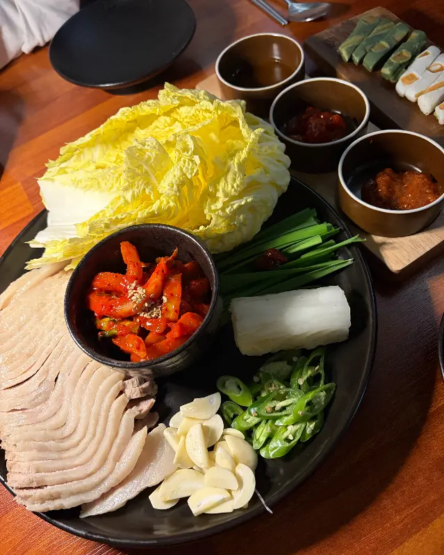 수육 한 점을 배추에 올리고, 무김치와 깻잎 장아찌를 곁들여 크게 한 입 먹으니, 입안 가득 행복이 퍼지는 듯했다. 부드러운 수육과 아삭한 무김치, 향긋한 깻잎 장아찌의 조합은 정말 최고였다. 유자 막걸리를 한 모금 마시니, 입안이 깔끔하게 정리되면서 다시 시작할 수 있을 것 같은 기분이 들었다.