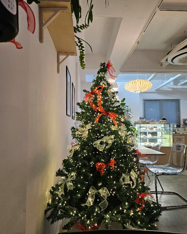 카페에 들어서자마자 따뜻하고 편안한 분위기가 나를 감쌌다. 은은한 조명 아래 놓인 아기자기한 소품들과 식물들이 공간을 더욱 매력적으로 만들었다. 큰 창밖으로 쏟아지는 햇살은 테이블 위를 부드럽게 어루만지며 따스함을 더했다. 크리스마스 시즌이라 그런지, 한쪽에는 아름다운 트리가 장식되어 있어 연말 분위기를 한껏 느낄 수 있었다. 마치 친구 집에 놀러 온 듯한 편안함에 절로 미소가 지어졌다.