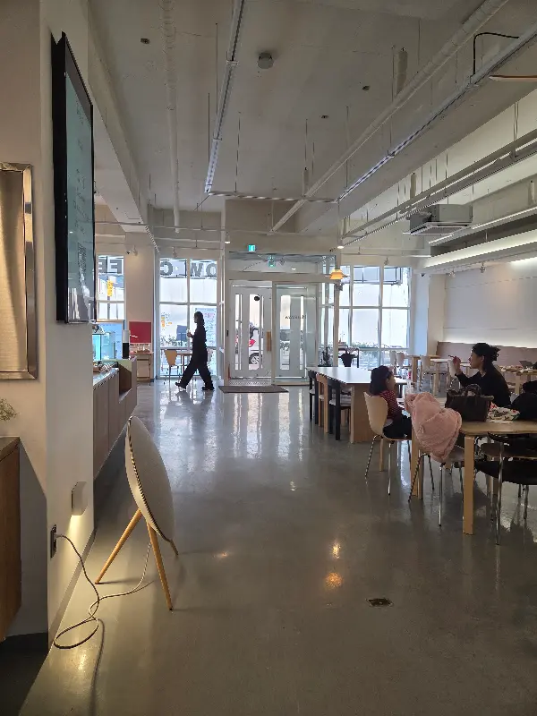 매장 내부는 생각보다 훨씬 넓고 탁 트인 공간이었다. 높은 천장과 커다란 창문 덕분에 햇빛이 가득 들어와 밝고 따뜻한 분위기를 연출하고 있었다. 은은한 조명과 편안한 의자들이 놓인 테이블은 마치 잘 꾸며진 카페에 온 듯한 느낌을 주었다. 혼자 조용히 책을 읽거나 노트북 작업을 하는 사람들도 있었고, 친구들과 담소를 나누는 사람들도 있었다. 넓은 공간 덕분에 테이블 간 간격도 넉넉해서 다른 사람들에게 방해받지 않고 편안하게 시간을 보낼 수 있을 것 같았다.