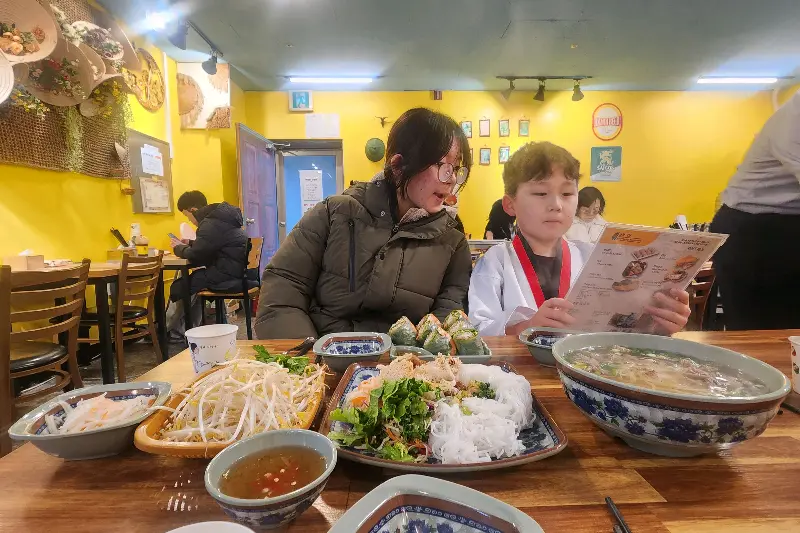 을 보면, 가족 단위 손님들이 많이 찾는 이유를 알 수 있다. 아이들이 쌀국수를 맛있게 먹는 모습은, 보는 사람까지 흐뭇하게 만든다. 는 쌀국수에 곁들여 먹는 각종 채소와 소스를 찍은 모습인데, 신선한 재료를 사용한다는 점을 엿볼 수 있다. 는 분짜의 모습인데, 쌀국수 면과 채소, 고기를 함께 소스에 찍어 먹는 베트남의 대표적인 음식이다. 은 테이블 전체를 찍은 사진인데, 쌀국수, 분짜, 짜조 등 다양한 메뉴를 한 번에 맛볼 수 있다는 점을 보여준다. 은 볶음 요리의 모습인데, 윤기가 자르르 흐르는 모습이 식욕을 자극한다. 은 쌀국수의 디테일 컷인데, 뽀얀 국물과 신선한 고명이 인상적이다. 는 반쎄오의 단면을 보여주는 사진인데, 속 재료가 푸짐하게 들어간 것을 확인할 수 있다. 마지막으로 은 메뉴판 사진인데, 다양한 메뉴와 가격을 한눈에 볼 수 있다는 장점이 있다.