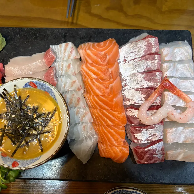 잠시 후, 드디어 기다리고 기다리던 숙성 모듬회가 등장했다. 검은색 돌판 위에 정갈하게 담겨 나온 회는, 그 화려한 비주얼에 감탄사가 절로 나왔다. 윤기가 좌르르 흐르는 다양한 종류의 숙성회들이 마치 예술 작품처럼 놓여 있었다. 흰살 생선부터 붉은 살 생선, 그리고 연어까지, 색감의 조화도 완벽했다. 특히, 회 위에 앙증맞게 올려진 새우 한 마리가 하트 모양을 하고 있는 모습은, 보는 이로 하여금 미소를 짓게 만들었다.
