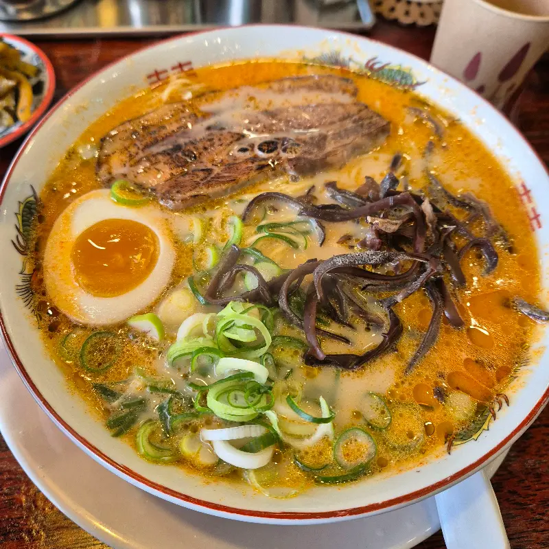 드디어 기다리고 기다리던 라멘이 나왔다. 뽀얀 국물 위에 차슈, 계란, 목이버섯, 파 등 다양한 고명이 푸짐하게 올려져 있었다. 먼저 국물부터 한 입 맛보았다. 깊고 진한 돈코츠 육수의 풍미가 입안 가득 퍼져 나갔다. 돼지 특유의 잡내는 전혀 느껴지지 않았고, 깔끔하면서도 담백한 맛이 일품이었다. 진한 국물 맛은 밥을 말아 먹고 싶다는 강렬한 욕구를 불러일으켰다.