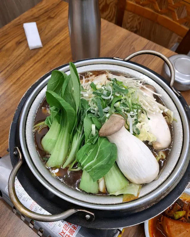 드디어 메인 메뉴인 한우 버섯 불고기 정식이 나왔다. 넉넉한 양의 불고기와 다양한 버섯, 채소가 푸짐하게 담겨 나왔다. 불고기는 달콤 짭짤한 양념에 잘 재워져 있었고, 버섯과 채소는 신선함이 느껴졌다. 불고기를 끓이면서 국물을 맛보니, 깊고 진한 맛이 입안 가득 퍼졌다. 불고기는 부드러웠고 버섯은 쫄깃한 식감이 좋았다. 특히, 국물에 밥을 비벼 먹으니 정말 꿀맛이었다.