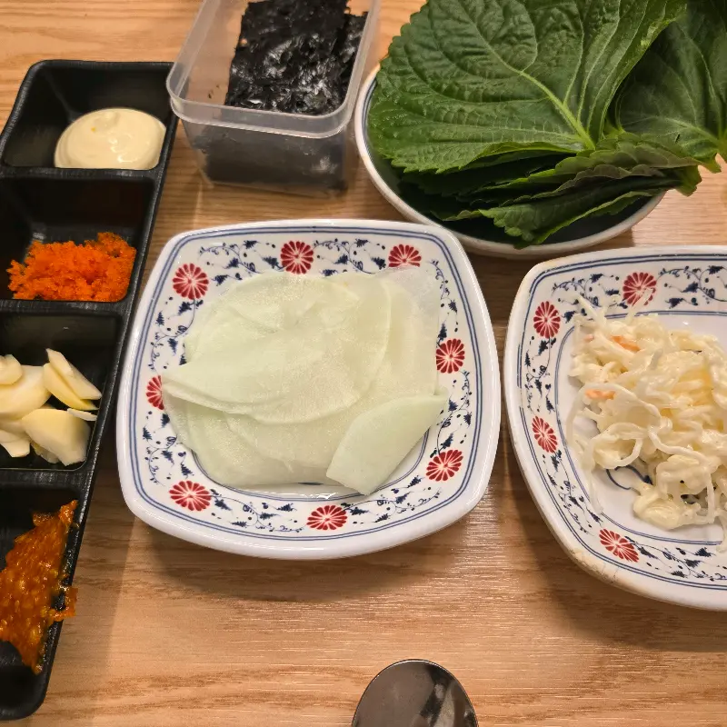 가장 먼저 눈에 띈 것은 흑색의 김이 담긴 통이었다. 쭈꾸미를 싸 먹으면 환상적인 조화를 이룰 것 같았다. 깻잎도 넉넉하게 담겨 나왔는데, 곰취처럼 큼지막해서 먹기 편했다. 쭈꾸미와 함께 쌈 싸 먹으면 향긋함이 입안 가득 퍼질 것 같았다.