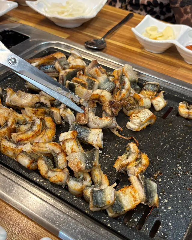 드디어 기다리고 기다리던 장어가 등장했다. 숯불 위에서 서서히 익어가는 장어의 모습은 그야말로 예술이었다. 껍질은 바삭하게 익어가고, 살은 촉촉함을 유지하는 것이 보기만 해도 느껴졌다. 직원분들이 직접 장어를 구워주시기 때문에, 나는 편안하게 기다리며 맛있는 냄새를 즐길 수 있었다. 전문적인 솜씨로 구워지는 장어를 보고 있자니, 빨리 맛보고 싶은 마음이 간절해졌다.