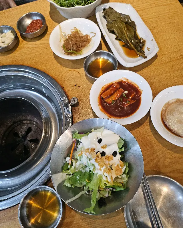 주문 후 얼마 지나지 않아 테이블 위로 푸짐한 밑반찬들이 차려졌다. 샐러드, 김치전, 잡채, 쌈 채소 등 다채로운 구성에 감탄했다. 특히 샐러드는 신선한 채소와 드레싱의 조화가 훌륭했고, 김치전은 바삭하고 매콤한 맛이 일품이었다. 밑반찬 하나하나 정갈하고 맛깔스러워서 메인 메뉴에 대한 기대감을 더욱 높였다. 사진을 보면 테이블 가득 차려진 밑반찬의 향연이 눈을 즐겁게 한다. 신선한 샐러드부터 윤기가 흐르는 잡채, 매콤한 김치전까지, 보기만 해도 군침이 돌았다.