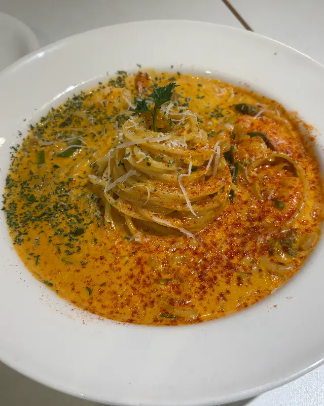 가장 먼저 나온 메뉴는 매콤크림파스타였다. 접시 가득 담긴 파스타 위에는 파슬리 가루와 치즈가 듬뿍 뿌려져 있었고, 매콤한 향이 코를 자극했다. 크림 소스는 보기에도 꾸덕꾸덕해 보였고, 매콤한 향과 어우러져 식욕을 더욱 자극했다. 포크로 면을 돌돌 말아 한 입 맛보니, 정말 대박이라는 말이 절로 나왔다. 크림의 풍미가 입안 가득 퍼지면서도, 매콤한 맛이 느끼함을 잡아주어 질릴 틈이 없었다. 면발도 탱글탱글했고, 소스와의 조화도 완벽했다. 왜 친구가 그렇게 칭찬했는지 단번에 이해가 됐다. 사진에서 볼 수 있듯이 소스가 넉넉해서 면을 다 먹고도 소스가 남아있었는데, 숟가락으로 싹싹 긁어먹을 정도로 맛있었다.