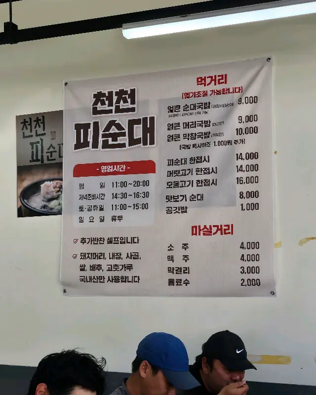 다양한 메뉴가 준비되어 있는 천천피순대 메뉴판
