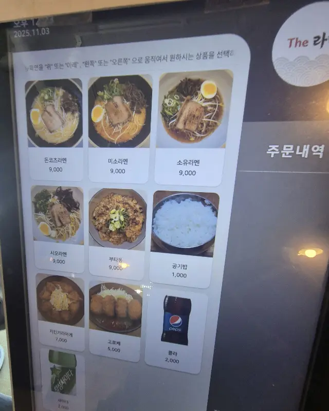 자리를 잡고 앉아 메뉴판을 살펴보니, 다양한 종류의 라멘이 준비되어 있었다. 돈코츠, 미소, 소유 등 기본적인 라멘 외에도, 독특한 풍미를 자랑하는 시오라멘까지. 선택의 폭이 넓어 잠시 고민에 빠졌다. 하지만, 가장 먼저 눈에 들어온 것은 역시 대표 메뉴인 돈코츠 라멘이었다. 진한 돼지 육수의 풍미를 그대로 느낄 수 있다는 설명에 망설임 없이 돈코츠 라멘을 선택했다. 키오스크를 이용해 간편하게 주문을 마쳤다. 요즘은 이렇게 키오스크 주문이 대세인 듯하다.