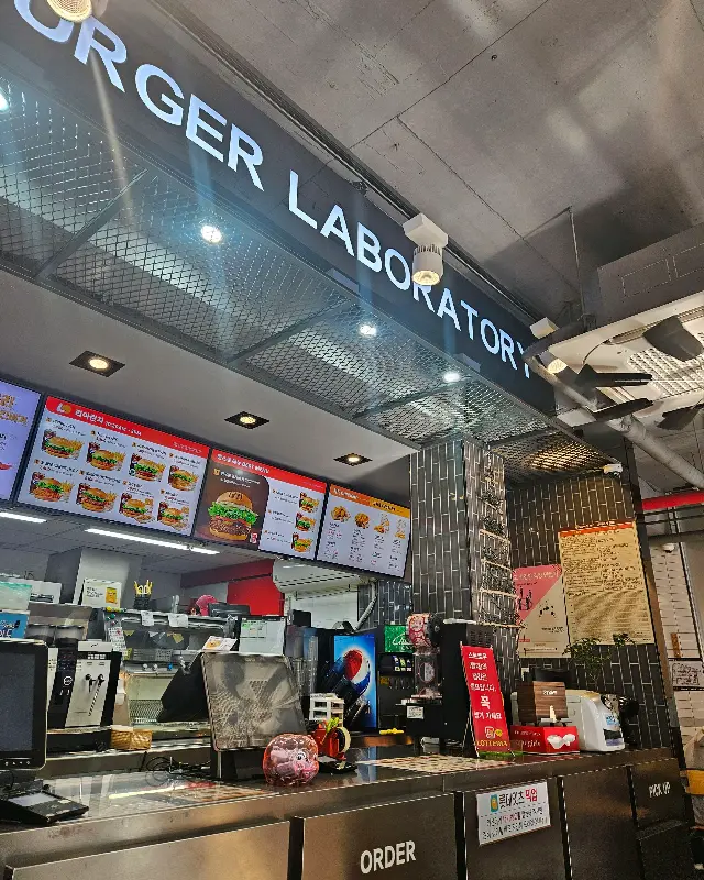 주문한 메뉴가 나오기까지 잠시 매장을 둘러봤다. 천장에는 “BURGER LABORATORY”라는 네온사인이 눈에 띄었다. 주문대 위쪽에는 다양한 메뉴 사진이 담긴 커다란 메뉴판이 걸려 있었고, 직원들은 분주하게 햄버거를 만들고 있었다. 예전에는 햄버거 만드는 모습을 직접 볼 수 없었는데, 요즘은 오픈 키친 형태로 되어 있어 위생적인 조리 과정을 확인할 수 있다는 점이 좋았다.