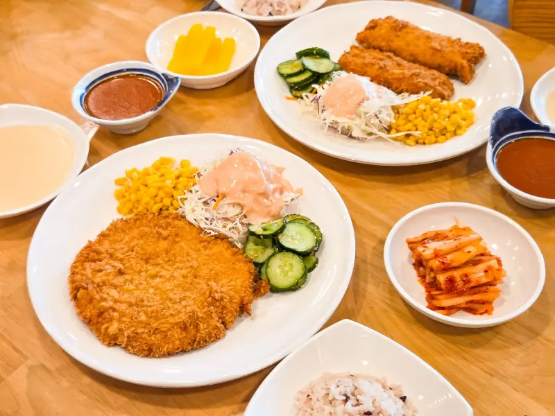 드디어 기다리고 기다리던 돈까스가 나왔다. 커다란 접시 위에 돈까스와 함께 양배추 샐러드, 콘, 오이 피클, 밥이 정갈하게 담겨 나왔다. 돈까스 위에는 윤기가 자르르 흐르는 갈색 소스가 듬뿍 뿌려져 있었다.