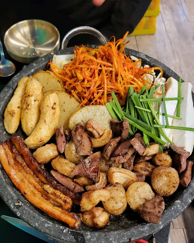 우리는 한우특모둠 기본 한 판을 주문했다. 잠시 후, 테이블 위로 화려한 향연이 펼쳐졌다. 곱창, 막창, 대창, 염통 등 다양한 부위가 푸짐하게 담겨 나왔다. 곁들여 나오는 반찬들도 예사롭지 않았다. 특히 순두부찌개가 기본으로 제공된다는 점이 마음에 쏙 들었다. 곱창의 느끼함을 잡아줄 칼칼한 국물이 필요했는데, 완벽한 조합이었다.
