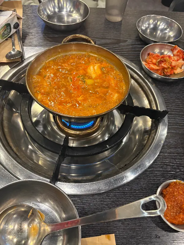 자리에 앉자마자 메뉴판을 정독했다. 곱창, 막창, 대창… 하나하나가 전부 유혹적이었다. 하지만 처음 방문한 만큼, 모든 맛을 한 번에 경험할 수 있는 모둠구이를 선택했다. 주문을 마치자, 순식간에 테이블 위는 다채로운 밑반찬으로 가득 찼다. 특히 나의 눈길을 사로잡은 것은 뚝배기에 담겨 보글보글 끓고 있는 순두부찌개였다. 얼큰하면서도 시원한 국물은 곱창을 먹기 전 입맛을 돋우기에 완벽했다.
