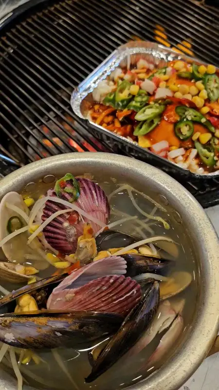 드디어 기다리고 기다리던 토핑 조개구이가 등장했다. 큼지막한 조개 위에 다채로운 토핑들이 듬뿍 올려져 있는 모습은 그야말로 장관이었다. 치즈, 초장, 고기, 맛살 등 다양한 토핑들이 조개와 어우러져 환상적인 비주얼을 자랑했다. 사진으로만 보던 비주얼을 실제로 보니 감탄사가 절로 나왔다. 얼른 맛보고 싶은 마음에 손이 떨릴 정도였다.